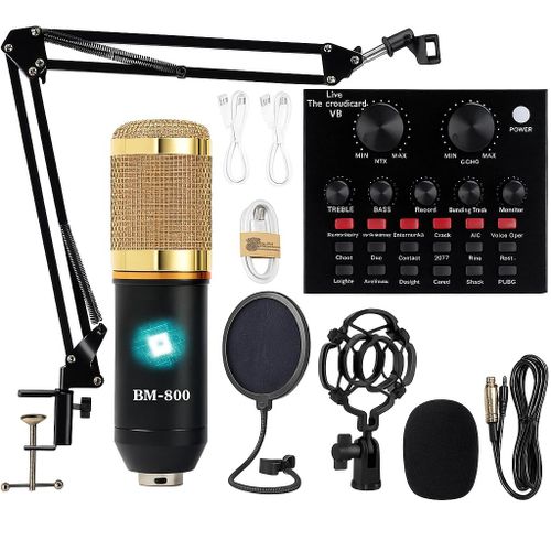 Upgrade your live streaming and recording experience with our comprehensive microphone and sound card kit. This kit includes a versatile live sound card and a professional condenser microphone. The sound card boasts 12 electronic sounds and 12 sound effects, making it a perfect companion for various applications such as singing, live streaming, recording, and more. The condenser microphone, with its cardioid polar pickup pattern, delivers high output and low self-noise, making it ideal for broadcasting, stage performances, and computer use.