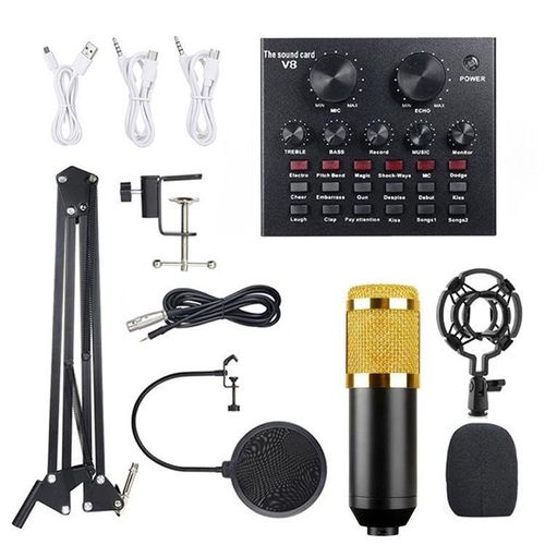 This complete podcasting set includes a BM-800 microphone, adjustable arm stand, shock mount, pop filter, anti-wind foam cap, power cable, and a live sound card. Designed for podcasting, streaming, music recording, and short video production, it offers a ready-to-use professional studio setup.